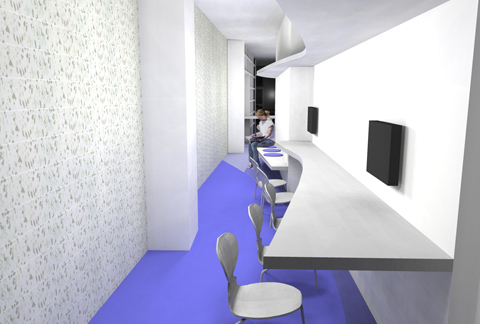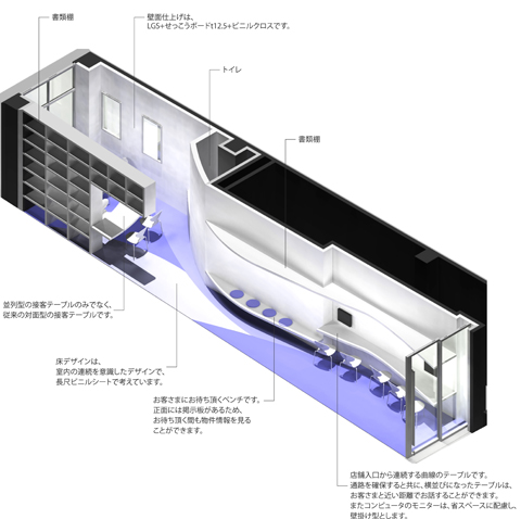町中にある不動産屋さんのインテリアのご提案です。 奥行きのある・細長い空間に、お客さまがゆったりと引き込まれるような店舗空間を目指しました。 対面式の接客スペースが確保できないため、店舗形状に合わせた横並びの接客方式とし、そのテーブルやベンチが店舗空間全体を構成します。