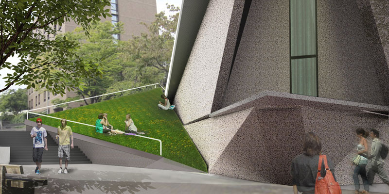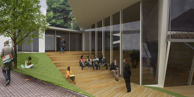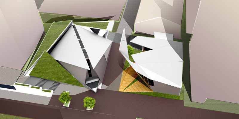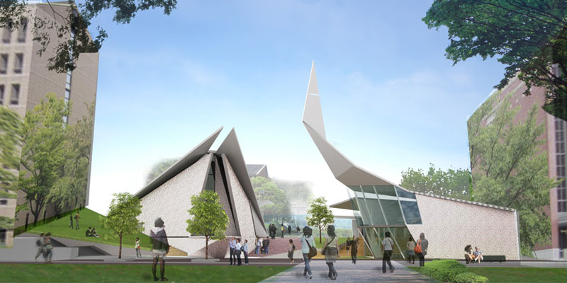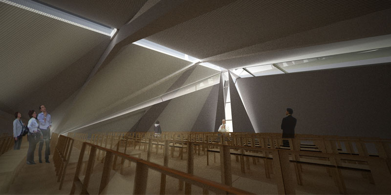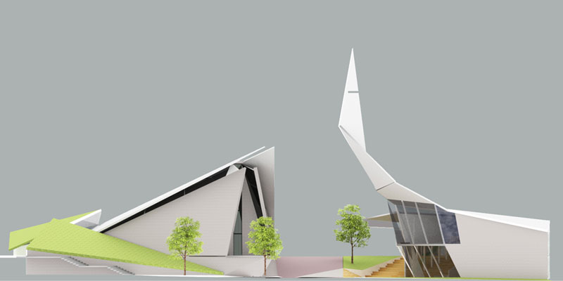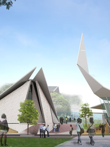 礼拝堂を囲むように各諸室を配置し、その延長線上から天空に伸びる十字架があります。この十字架は、礼拝堂とキリスト教文化センターの中心であるとともに、キャンパスの中心です。地面が隆起したような屋根とそれを利用した登り庭、周囲の建物からも容易にアクセスが可能な動線は、礼拝堂をより学生にとって身近な存在とします。礼拝堂とキリスト教文化センターは、道路を挟み分棟型の形態となっていますが、道路も広場のように扱うことで、施設全体が一つの空間となり、一体的な利用が可能となります。