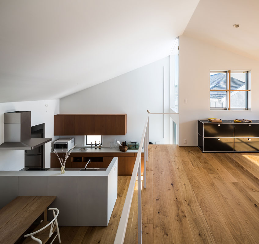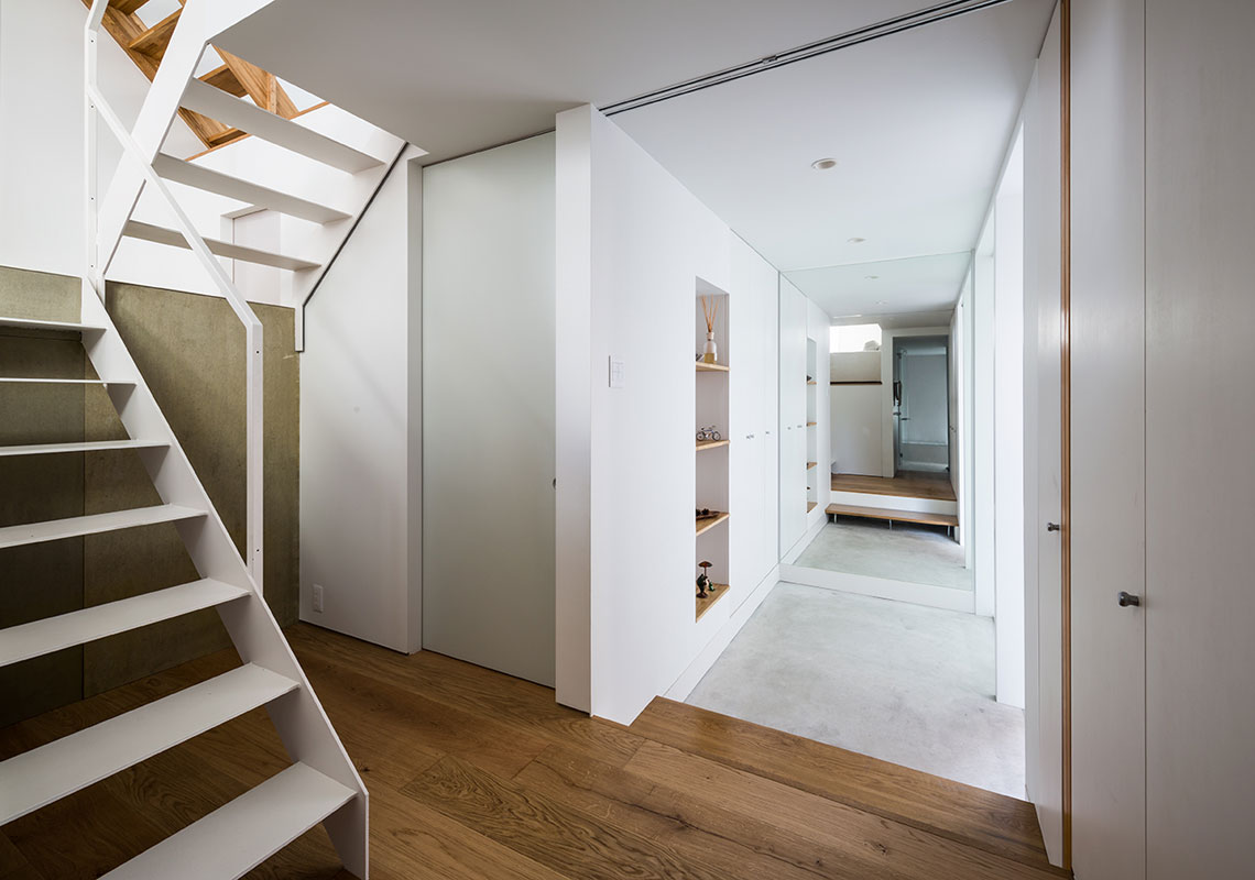 上下左右に空間をずらすことで、駐車場・エントランスアプローチ・テラス・庭空間がうまれる、敷地空間を一体的・立体的に利用した住宅を目指しました。建物内部はスキップフロアにより緩やかに連続させると共に、ズラしたことによってうまれた外部空間とも緩やかに連続します。これら連続する内外部の空間は、分断されることがない光・風・気配の通り道となります。