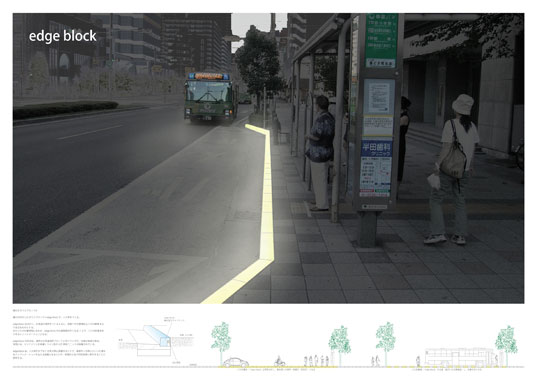 縁石の形をしたガラスブロック=edge blockで、バス停をつくる。