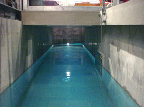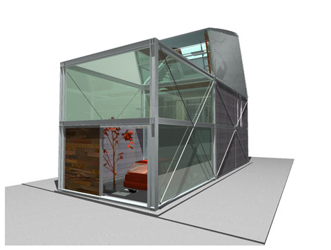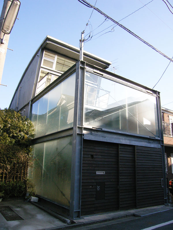 東京世田谷の閑静な住宅街で、プライベートなプールをもつ住宅である。 プールの開放感、周囲からの視線といった相反する条件を満たすように、様々なガラスを使った壁によって、プライベートな外部空間をつくりだす。プールは、広くはない敷地のため、居室の下をくぐる。 仕事のためのスタジオ、料理を楽しむためのキッチン、くつろぐための和室をもつ。それぞれは、その生活スタイルにあわせ、シームレスで時々切り離される